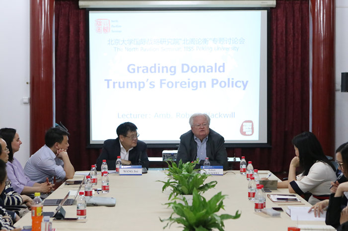 2019年5月13日晚上,北京大学国际战略研究院举办第34期“北阁论衡”系列讲座。美国对外关系委员会亨利·基辛格高级研究员,曾任哈佛大学肯尼迪政府学院副院长、美国驻印度大使的罗伯特·布莱克威尔(Robert D. Blackwill)以“给特朗普外交政策打分”(Grading Donald Trump’s Foreign Policy)为题做讲座。本次讲座由北京大学国际战略研究院院长、北京大学国际关系学院教授王缉思主持。